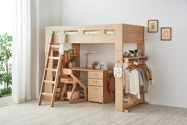 ハンガーラックやシェルフは内向き・外向きの配置変更が可能で、ベッドを下に降ろせばそれぞれ単独でも使用できます。