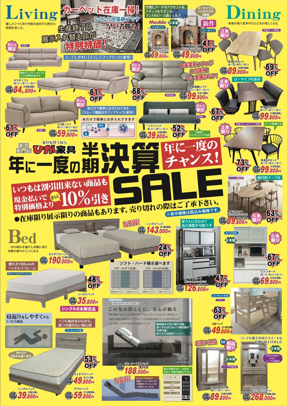 ひが家具 半期決算セール開催! 2026.01.23 イベント 開催場所 北谷店 & 与那原店 開催日 1月24日(土)~2月15日(日) 開催時間 10時00分~19時00分 ひが家具 半期決算セール開催! 日頃のご愛顧に感謝して、半期決算セールを開催します! 期間中はなんと… 現金でのお支払いで通常価格より『10%OFF』!! 半期決算のため、店内の展示品や限定特価品、一流メーカー製品まで、ドーン!とお買い得に大放出! 家具をお得に揃える絶好のチャンスです。 この機会をぜひお見逃しなく!! 皆さまのご来店をスタッフ一同、心よりお待ちしております。 ■ 半期決算セール開催期間 1月24日(土)~2月15日(日) ■ 店舗休業日 ・2月2日(日)…与那原店 休業 ・2月3日(月)…北谷店 休業 ※一部割引対象外の商品がございます。 ※限定品は、期間に関わらず売り切れ次第終了となります。 btn