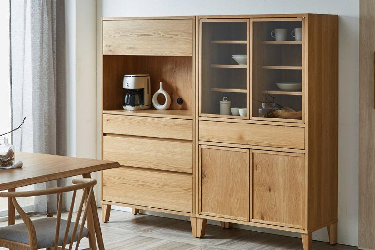 ホワイトオーク無垢材を使用した、上質で温かみのあるガラス扉キャビネット。