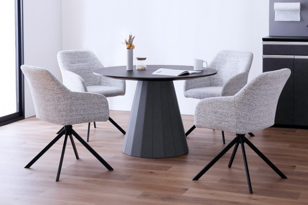 ファブリック張りの座面とアイアン脚の組み合わせ、機能性とデザイン性を兼ね備えたダイニングセットです。